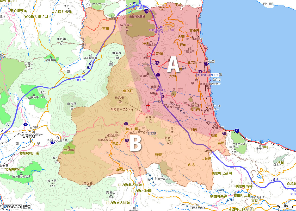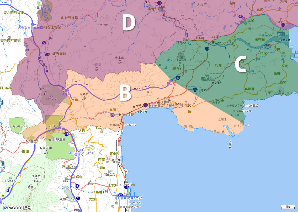 B:日出町内 C:杵築市内一部 D:C以外の杵築市内、国東市、宇佐市
