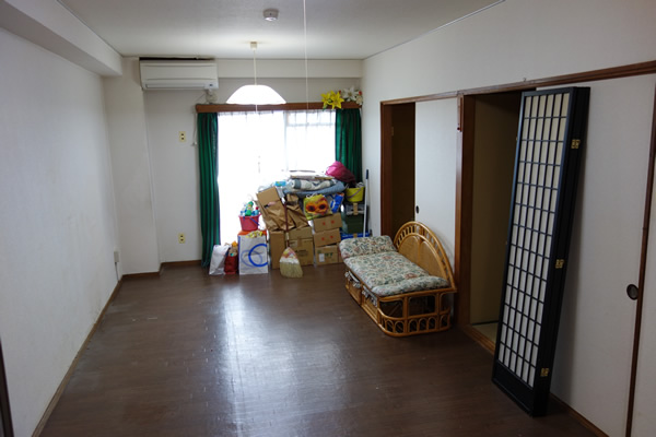 画像は居間の前、後と和室の前、後です。居間は必要な家具と物だけを残して片付けました。和室は全て回収だったので、照明だけを残してキレイに片付けました。